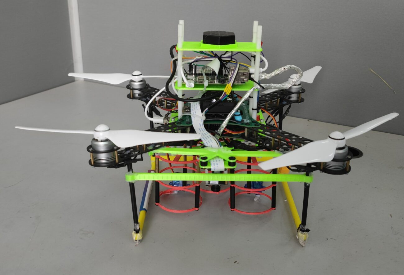 一架四旋翼无人机,支持手动和自动操控的无人机,使用PX4开源飞控,树莓派4B作为飞行计算机。下有三个货舱用于运载货物,舱门由舵机控制打开。使用到的传感器:一个下视单目摄像头、一个激光测距传感器、一个电子罗盘。