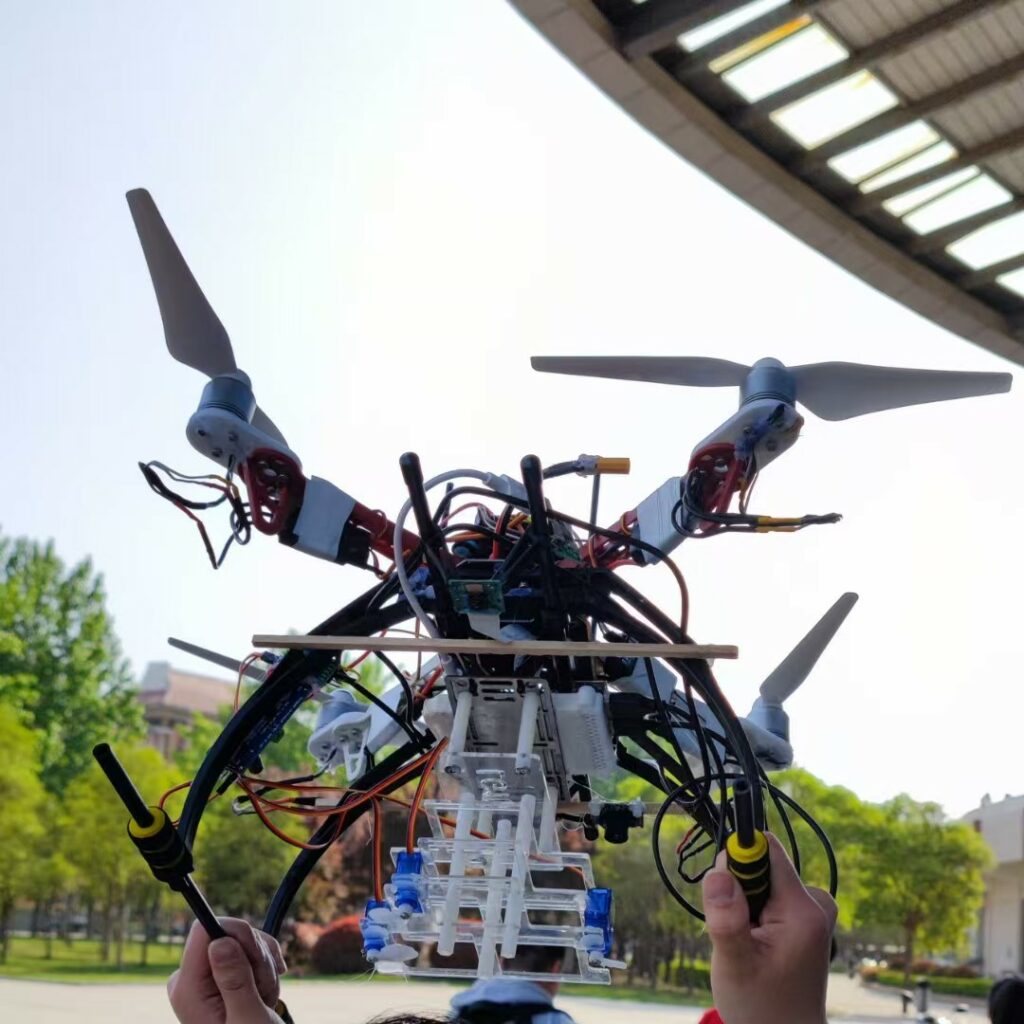 参加省赛时,还没有考虑轻量化设计(经费不足),这个版本比参加国赛的版本重了一倍,操控性不如国赛的版本,最终是以河南省第一的成绩入围国赛。入围国赛后,学校给的经费多了,开始自己画图定制碳纤维板,机架由塑料换成了碳纤维,最终就是封面图的样子。这个版本重量轻,操作灵活了很多,但是碳纤维材料很脆,摔下来的时候很容易就碎了,还好调试时练就了快拆快修的本领,才能顺利完成比赛。