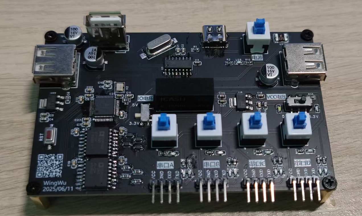 工作时经常需要用到多个串口,特意做了这个小工具,将USB集线器和四合一串口集成在一起,方便使用。主要芯片为SL2.1A和CH9344L。